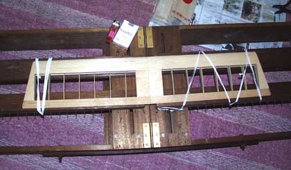 左の写真は現在製作中の02クラスの スポーツ機の主翼です。 治具のあらゆる個所が可変するので、 大型機から小型機までこの様に ピッタリとフイットします。 |