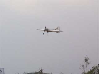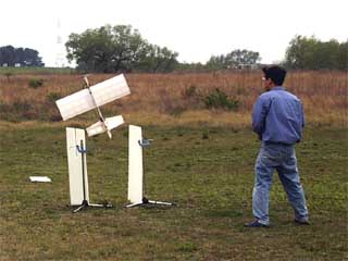 最初に機体の癖を見るために、普通の手なげで離陸。約3分ほどの上空飛行できっちりトリムや舵の利きを確認して着陸させました。 下の写真は目的の垂直離陸の実験となった2フライト目の様子です。初飛行で一本しかなかった1250mAの電池を既に使ってしまっていたので、重量的には不利な2000mAの電池でのテストです。 1250mAで全備重量800g、2000mAでは906gにもなります。しかし、連日のパワーテストでの強力な引きから、一分程度であればかなりの事が出来るだろうとの感触はつかんでいました。 垂直離陸スタンドに機体をセットしていると、予想通りたくさんの仲間が滑走路に出てきました。さすがに呆れられるだろうと思っていましたが、やはり冷たい(一部は暖かい!?)視線が集まりました(笑)。でも、みんな興味津々!?