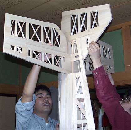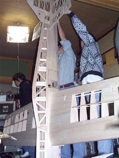 1人が胴体を押さえている間に、左右から2人がかりで主翼を差し込みました。 主翼がなんとか付いたところで、また背の高い若者にヒンジなしの動翼を機体に押さえてもらいました。 さあ、これでやっと機体全体の様子が見られるかと喜んだのもつかの間、部屋が狭すぎて引きがなく、機体の全体を眺める場所がありません。