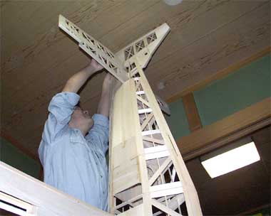 そんなおり、たまたま若いクラブ員2人が家に遊びにきました。 そこで、これはよい機会と3人で無理は承知の深夜室内で仮組みの強行です!(笑) 機体の各部分は、制作中のエルロン以外は完成しています。
